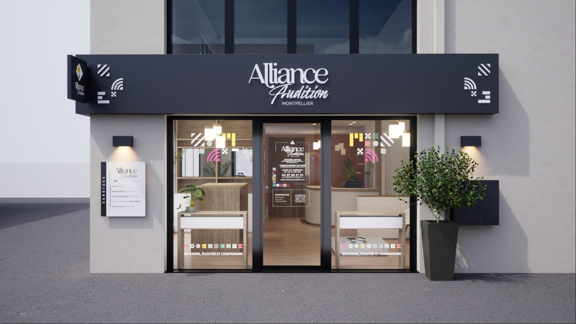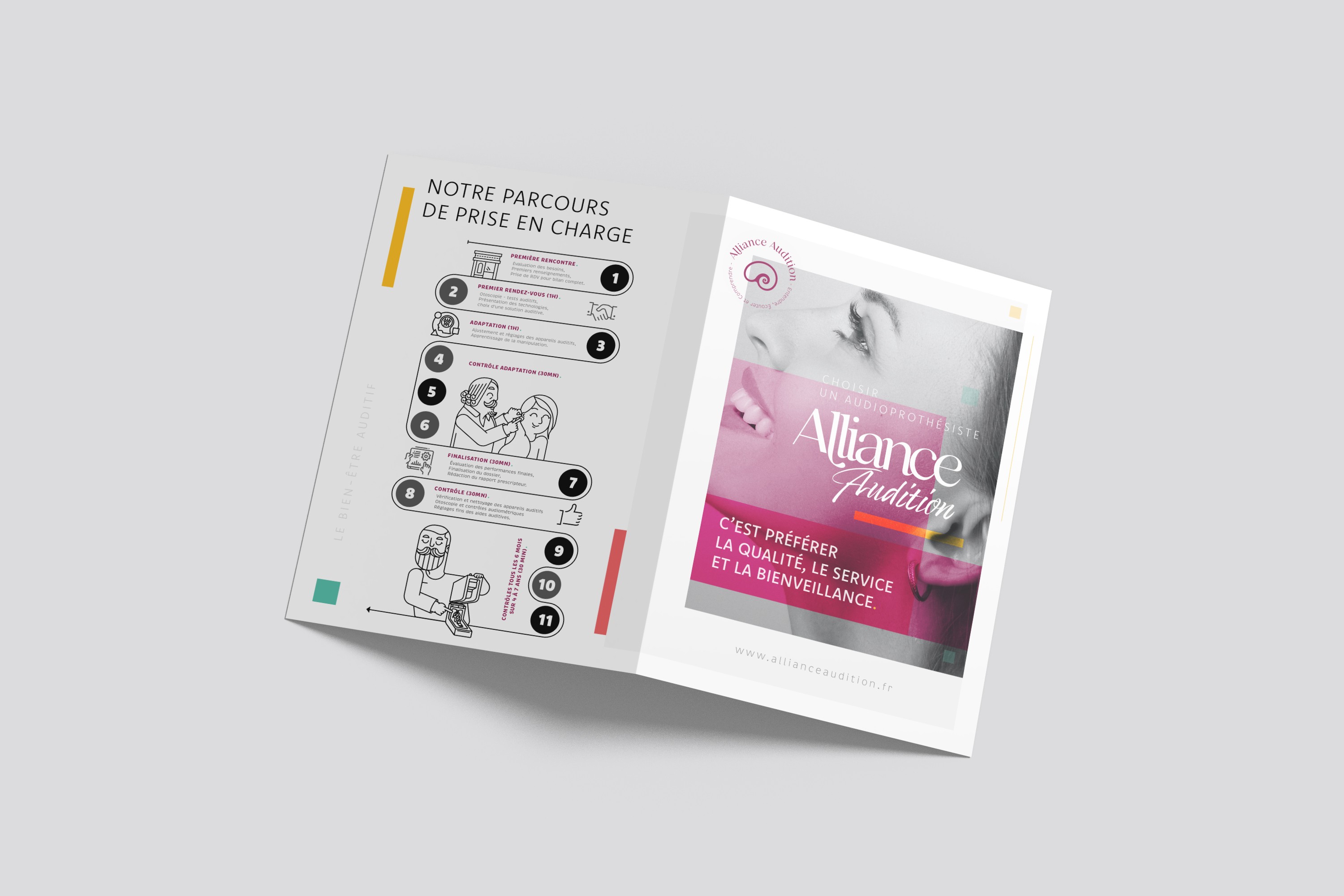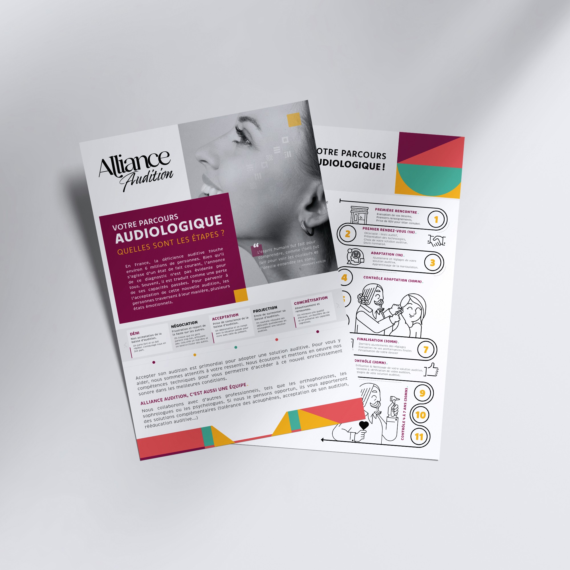 Refonte de l’identité visuelle et des outils de communication print et évènementiels. Création d’illustrations modernes reprenant les gestes du métier d’audioprothésiste. Création d’un concept magasin unique (enseigne, vitrophanie, signalétique, aménagement).