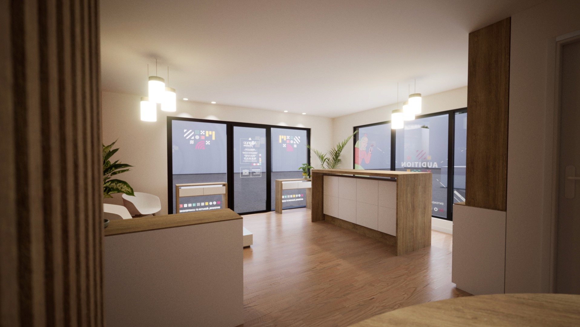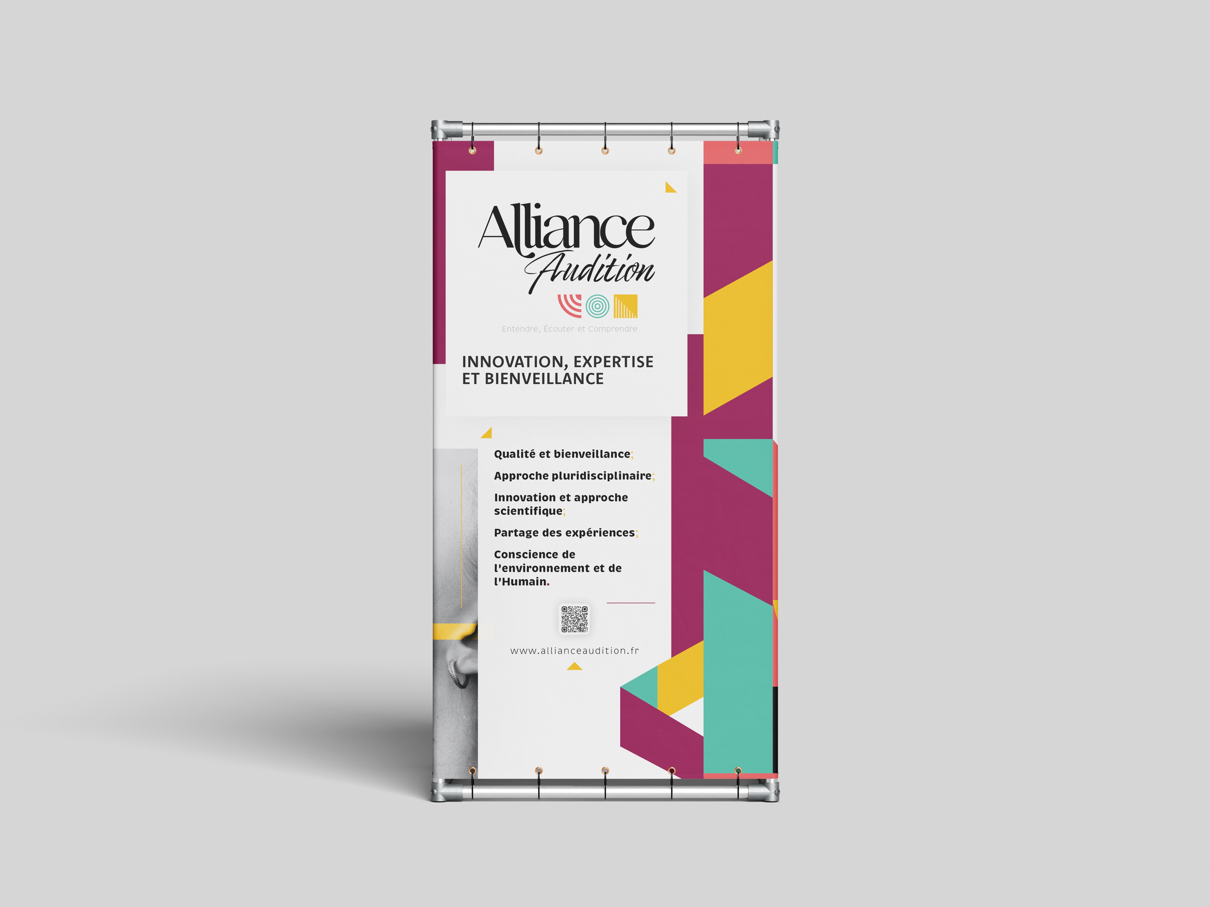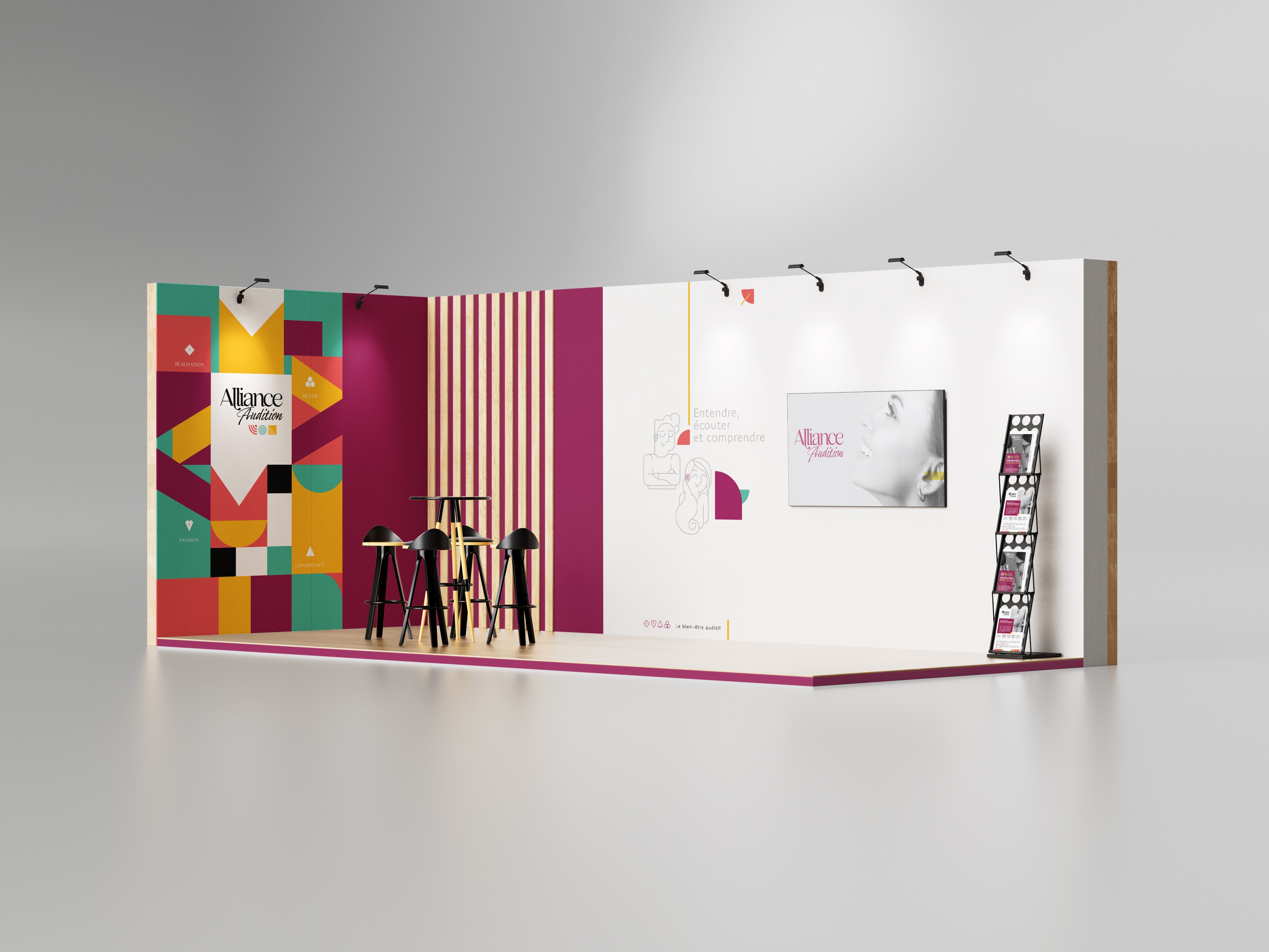 Refonte de l’identité visuelle et des outils de communication print et évènementiels. Création d’illustrations modernes reprenant les gestes du métier d’audioprothésiste. Création d’un concept magasin unique (enseigne, vitrophanie, signalétique, aménagement).